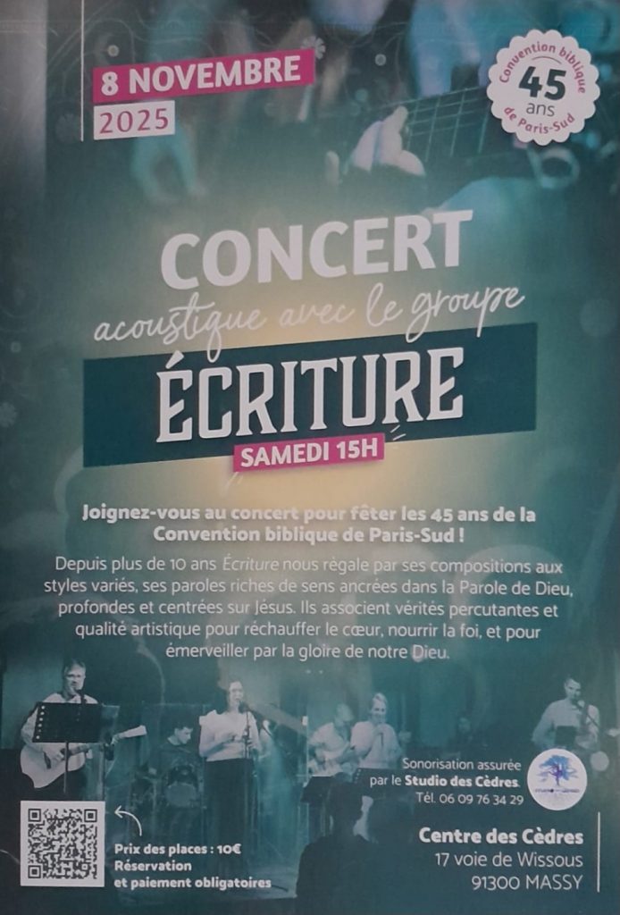 Écriture en concert acoustique pour les 45 ans de la Convention biblique Paris-Sud 🎶 Rendez-vous le samedi 8 novembre dès 14h30 pour un temps fort de louange et de célébration avec Écriture