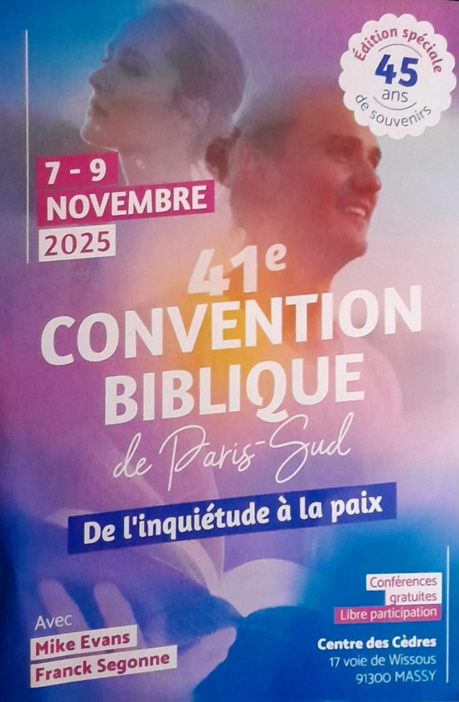 La Convention fêtera cette année ses 45 ans d’existence. Elle aura lieu du 7 au 9 novembre avec comme thème :« De l’inquiétude à la paix ». Les messages seront apportés par Mike Evans et Franck Segonne.